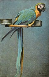 blue & yellow macaw faces right on perch