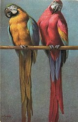 two red /blue/gold macaws sit on perch, one on right looks in pan