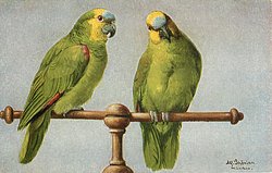 two mostly green & yellow parrots on perch