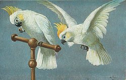two yellow crested cockateels look left, one on perch, one flying