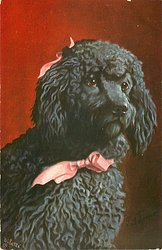 black poodle, pink ribbon,looking right