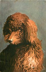 brown poodle with waves and curls, dog looks down to left, bright spot on shoulder