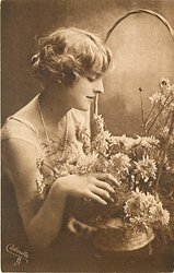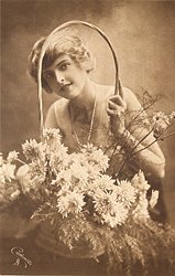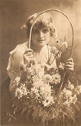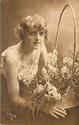pretty girl looks through hoop of flower basket her left hand holds flowers