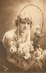 pretty girl holds hoop of basket of flowers with both hands, faces slightly left, looks front