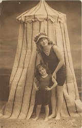 mother & child in front of striped canvas bathing tent, mother to left, holding door with left hand, child in doorway