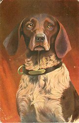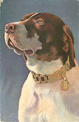 back title POINTER, ENGLISCHER VORSTEHUND brown & white pointer looks up and left, brass collar, blue background