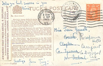 poster style, PRINTED IN ENGLAND, comes with handstamp NOT PUBLISHED BY LIQUOR CONTROL BOARD OR GOVERNMENT OF BRITISH COLUMBIA & with label AWARDED FIRST PRIZE MEDAL & DIPLOMA IN COMPETITION OPEN TO ALL BRANDS OF SCOTCH WHISKIES, BREWER'S EXHIBITION, LONDON, ENGLAND
