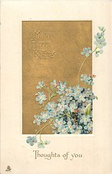 MANY HAPPY RETURNS in gilt on gold plaque, blue forget-me-nots on gold background, THOUGHTS OF YOU below