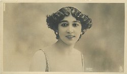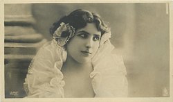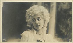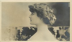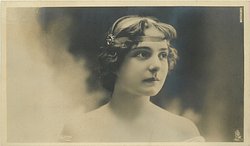 head & shoulders study of brunette with short hair, large frilly lace collar, faces front looks right