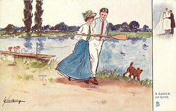 RIVER DAYS heavily laden young man walks in front of pretty girl along river bank