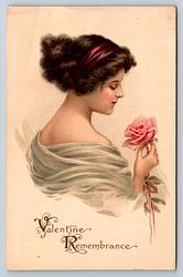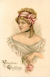 VALENTINE GREETINGS woman with bare shoulders, facing right, pink ribbon in hair, holds pink rose in right hand