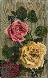 one pink rose, one yellow rose, one smaller red rose botton left