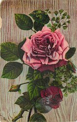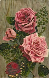 two pink roses, one red bud and one pink bud