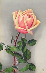 single orange/pink rose, stem to lower center left, looks like a string hangs from bottom of bloom