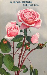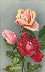 one red & one yellow/pink rose to right, pink openened bud to left, stems to lower centre