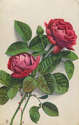 two red roses and one bud, two stems to lower left corner