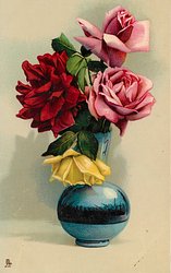 vase with gilt bands & decorated with pink roses, three red roses & bud