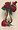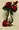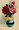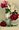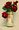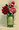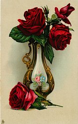 vase, floral design within gold, three red roses & bud & another one lying on table