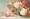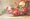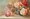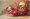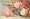 bowl right with four open roses, many buds, no petals on table, signature lower right