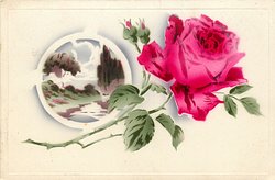 pink/white rose with stalk to lower left, circular rural three tree inset left