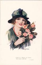 woman in black hat, purple ribbons, holds red roses, faces right, looks front