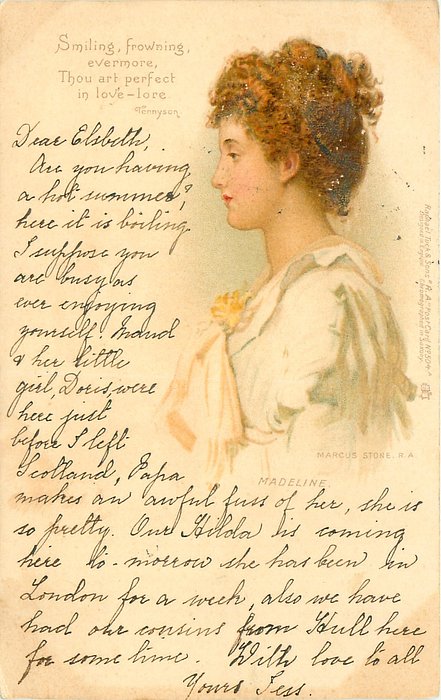 verse:- SMILING, FROWNING, EVERMORE, THOUGH ART PERFECT IN LOVE-LORE., same image H see previous card