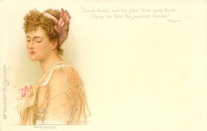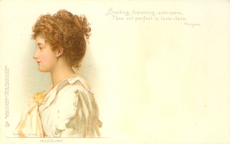 verse:- SMILING, FROWNING, EVERMORE, THOUGH ART PERFECT IN LOVE-LORE., same image V see next card