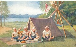 four young men sit eating & drinking in front of tent, flag flying from tripod of oars behind