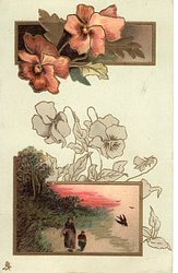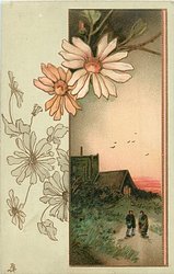 picture at right, daisies, 2 people on path, church behind , recent sunset