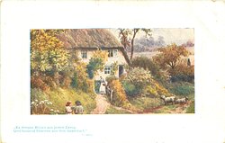 woman at thatched cottage gate, two sheep in lane, two people front left