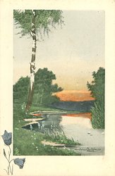 large inset, blue calendulas lower left margin, tall silver birch left, golden sky & reflection back, stream front/right