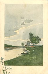 clover lower left margin, road left with man walking away, mid-distant central windmill, sun on horizon