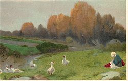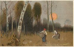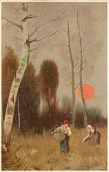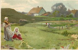 two girls at left in field, one watches a distant worker, farm buildings behind