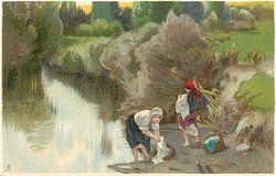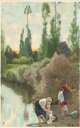 two women at river washing clothes, left one bent over, other carrying clothes to water