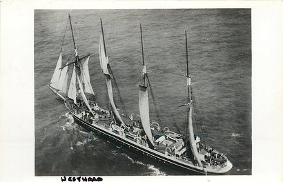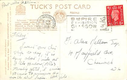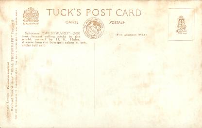 back information :- SCHOONER "WESTWARD" - 2,000 TONS - LARGEST SAILING YACHT IN THE WORLD, OWNED BY H.K. HALES. MOORED IN POOLE HARBOUR, DORSET, AS A UNIQUE FLOATING HOTEL, COMPLETE WITH EVERY LUXURY, AND ACCOMMODATION FOR 80 VISITORS.