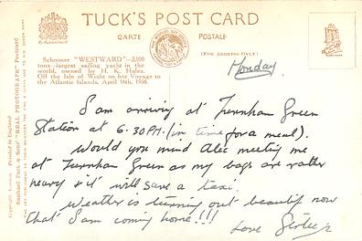 back information :- THE "WESTWARD" PROCEEDING DOWN CHANNEL ON HER WAY TO THE ATLANTIC ISLANDS, APRIL 16TH, 1938.
