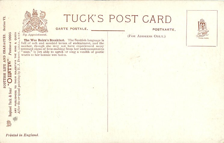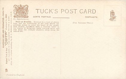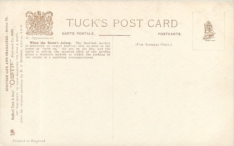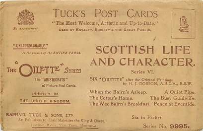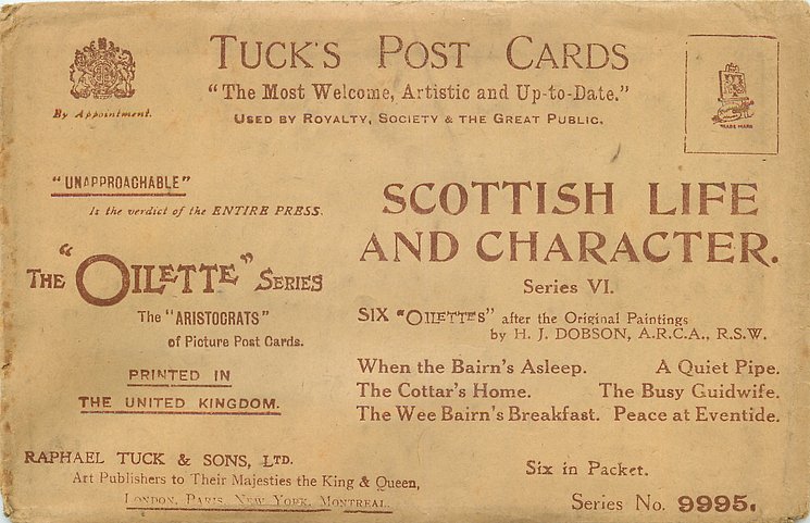 OILETTE, come Oilfacsim but not so trade-named. PRINTED IN ENGLAND with or w/o COPYRIGHT LONDON AFTER THE ORIGINAL PAINTING BY H.J. DOBSON, A.R.C.A. R.S.W., listed in1911/1912 & 1913/1914 &1930 POSTCARD Catalogues