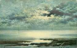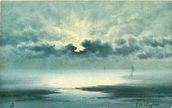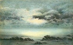 jagged rocks from each side of card & at middle in front of others, no silhouettes of ships on horizon