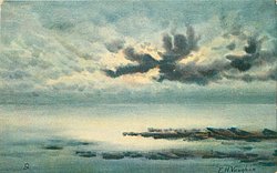 few rocks left, two bands of jutting rocks center to right of card, two distant ships & reflections on horizon