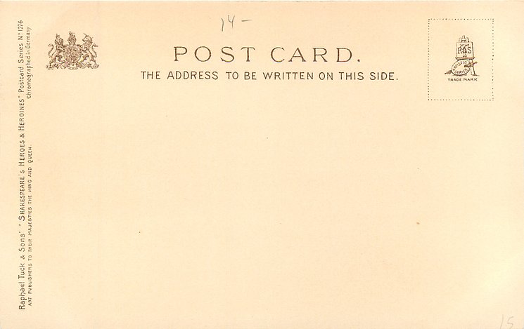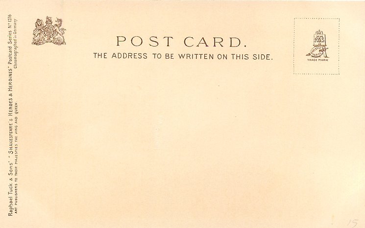 u/b, CHROMOGRAPHED IN GERMANY, SERIES I. on packet, not on cards, quotes from play at bottom of each card, listed in 1904 & 1908/1909 & 1911/1912 Postcard Catalogues