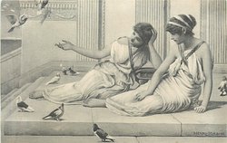 two girls sit on stone steps, pigeons around