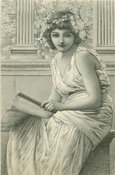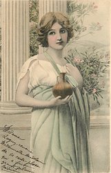 short haired brunette stands on stone balcony holding vase & flowers, facing partly right, looking front, 2 columns behind
