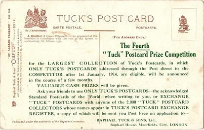 OILETTE, PUBLISHED UNDEER THE AUTHORITY OF THE PAGEANT COMMITTEE, listed in 1912 & 1914 Postcard Catalogues, come with back covered by advertising in green for THE FOURTH "TUCK" POSTCARD PRIZE COMPETION see scan