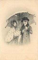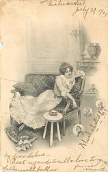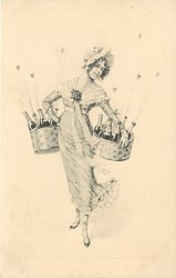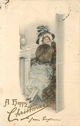 girl seated on chair, large elaborate hat, fur muff, ruffled dress, edge of mantle to left with urn