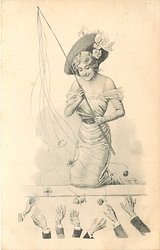 girl kneels on wall, fishes with tokens for reaching male hands below