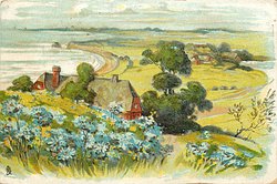 blue cornflowers in foreground, house over brow of hill, distant sea to left, countryside to right
