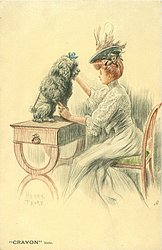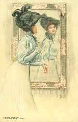 woman sitting in chair, has pencil in right hand at mouth, left hand holds notes