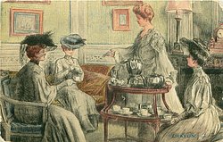 woman stands behind table with tea service on it, three others sit holding tea cups