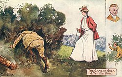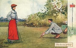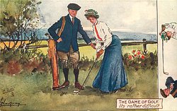 THE GAME OF GOLF young man constructs a tall tee for pretty girl,