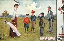 A FINE STROKE lady golfer astonishes male onlookers